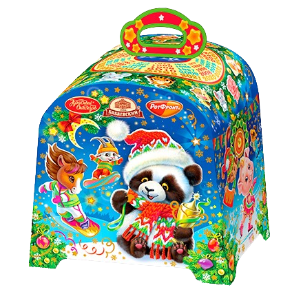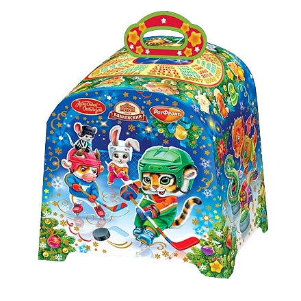 A bright, colorful cardboard chest filled with an assortment of candies. Almost all types of sweets from legendary confectionery factories are represented. A full kilogram of treats.