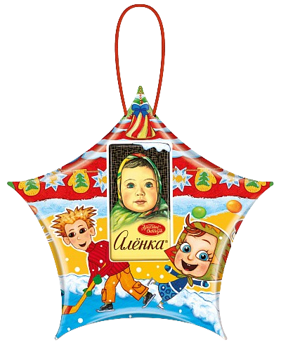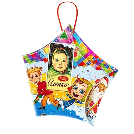 This gift is packed in a bright, star-shaped cardboard box. A small yet sweet holiday treat featuring Alyonka brand goodies for New Year's celebrations.
