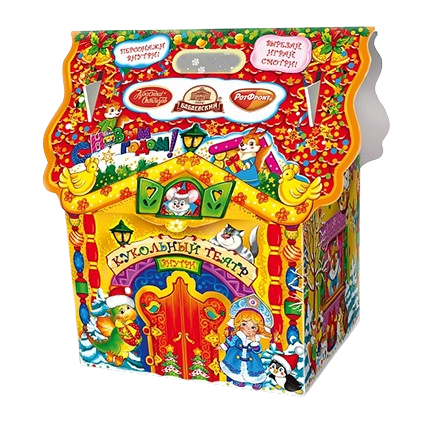The sweet set "Terem-Teremok" is two gifts in one! A whole 800g of selected candies and a real puppet theater! The cardboard box transforms into a stage, complete with character cards. Create your own magical story with children and enjoy your favorite candies.